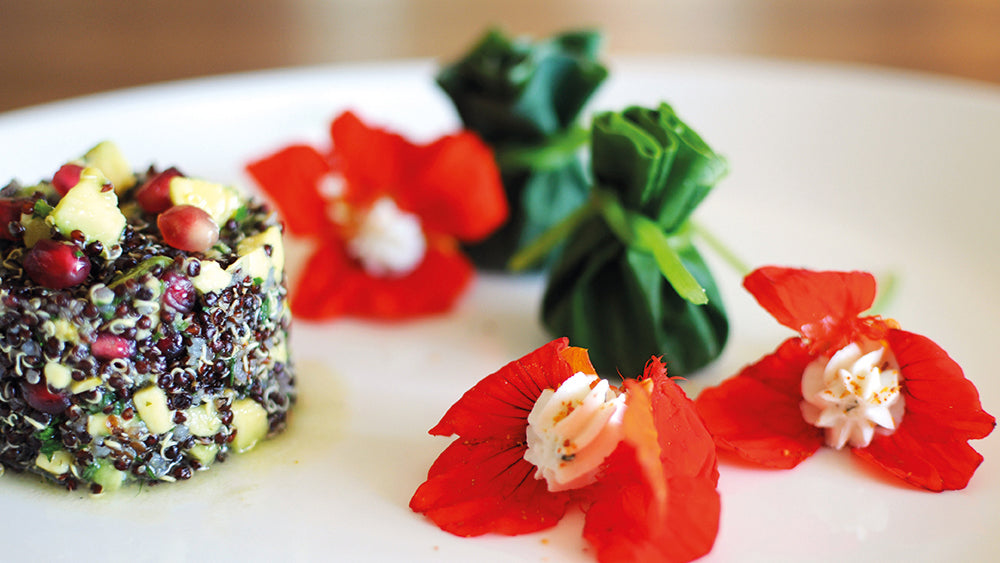 FLEURS ET FEUILLES DE CAPUCINES FARCIES À LA MOUSSE DE CHÈVRE, VERRINE DE QUINOA NOIR MENTHE-GRENADE
