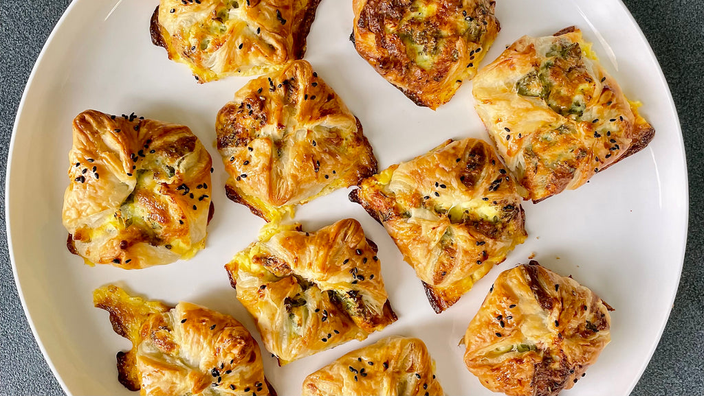 Badigeonner les feuilletés avec un jaune d’œuf et parsemer de sésame noir.