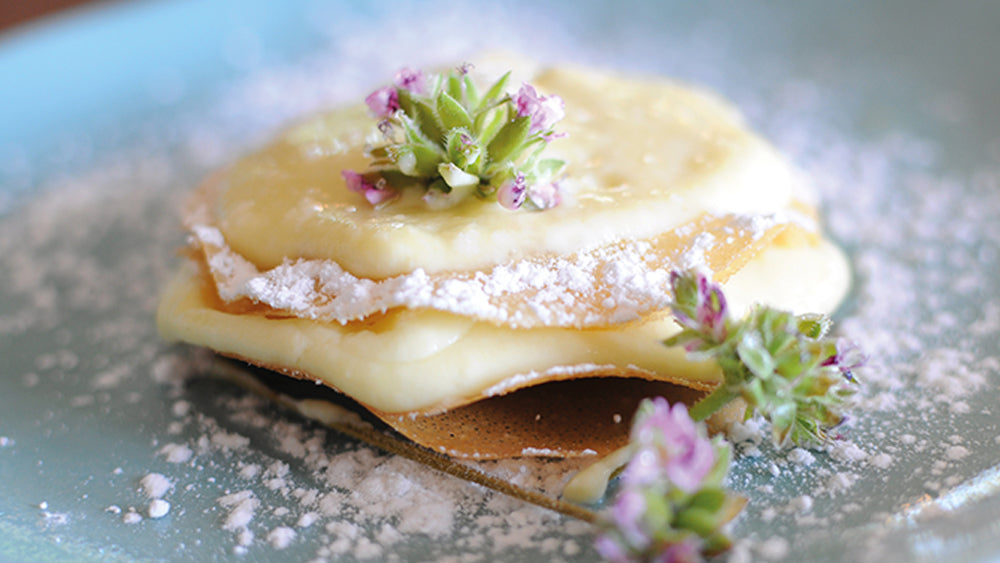 › Monter les croustillants en alternant les disques de bricks superposés 2 par 2 et la crème de géranium citron.