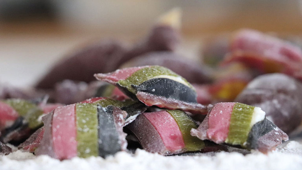 | Passer la pâte dans la machine à pâtes en changeant l’épaisseur graduellement du plus gros au plus fin jusqu’à l’obtention d’une pâte rectangulaire fine d’un millimètre.