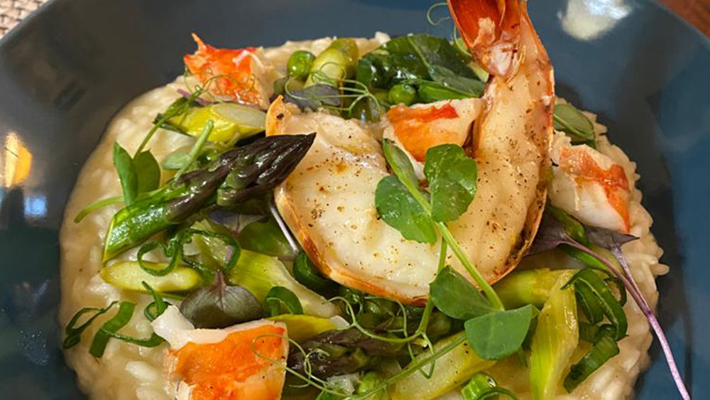 RISOTTO AUX LÉGUMES PRINTANIERS, GAMBAS GÉANTES SNACKÉE