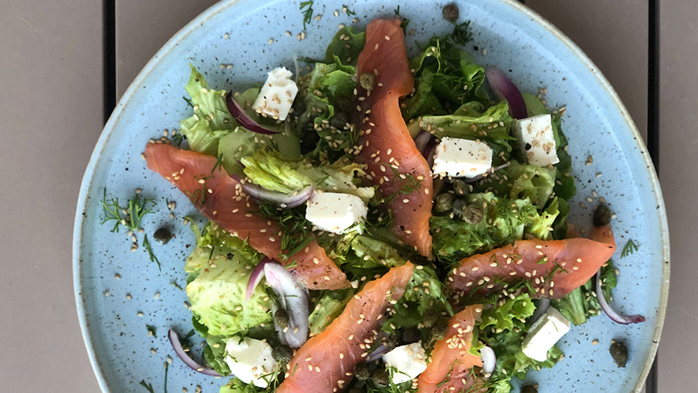 - 4 | Disposez le saumon, la feta, les tranches de concombre et les tranches d'oignon sur la salade.