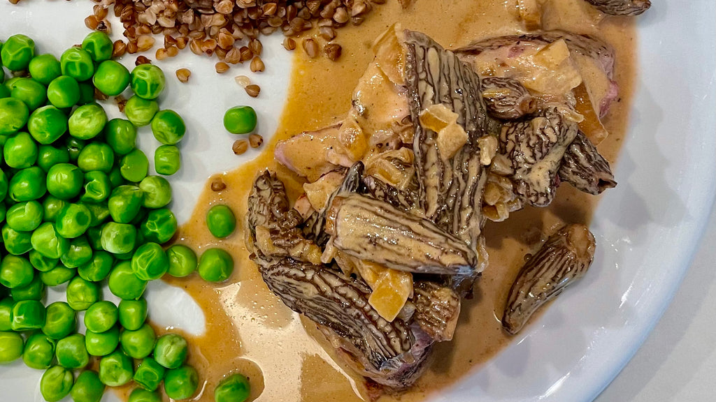 50g morilles séchées, trompées dans l’eau tiède 30min