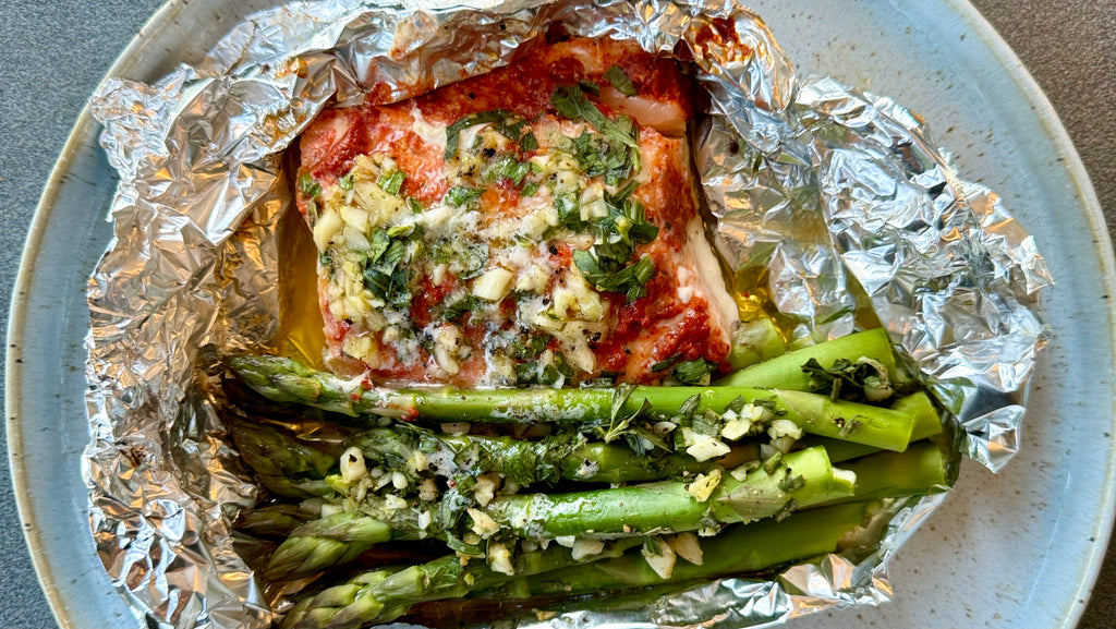 Disposer sur chaque fiche de papier alu le saumon et les asperges.