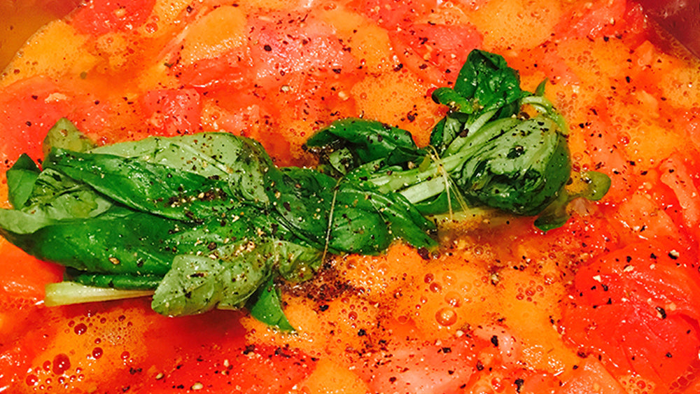 - 3 | Ajouter les tomates, le basilic, le bouillon et le sucre et faire cuire pendant 20 minutes à feu doux.