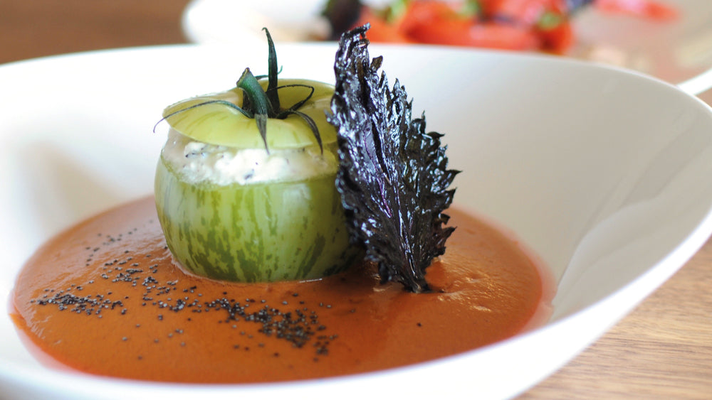 › Couler à l’aide d’une pipette l’huile aromatisée au centre d’une assiette, puis couler doucement la soupe froide sur l’huile.