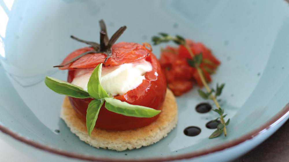 - 7 | Garnir les tomates confites avec la brunoise de tomates puis ajouter la mousse de mozzarellas au siphon.