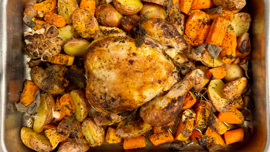 Disposer les feuilles de sauge sur le poulet et les branches de thym sur les légumes.